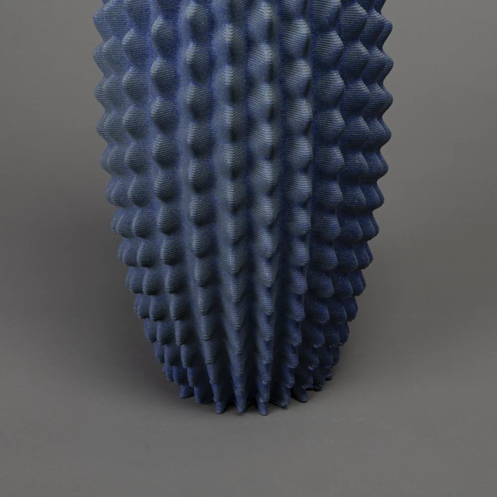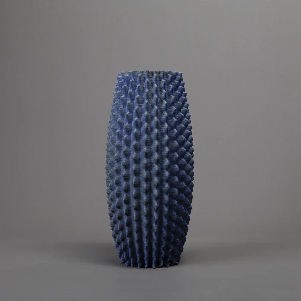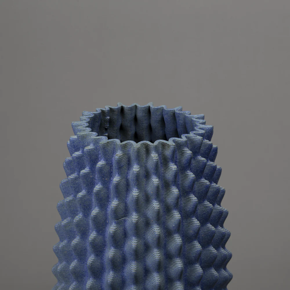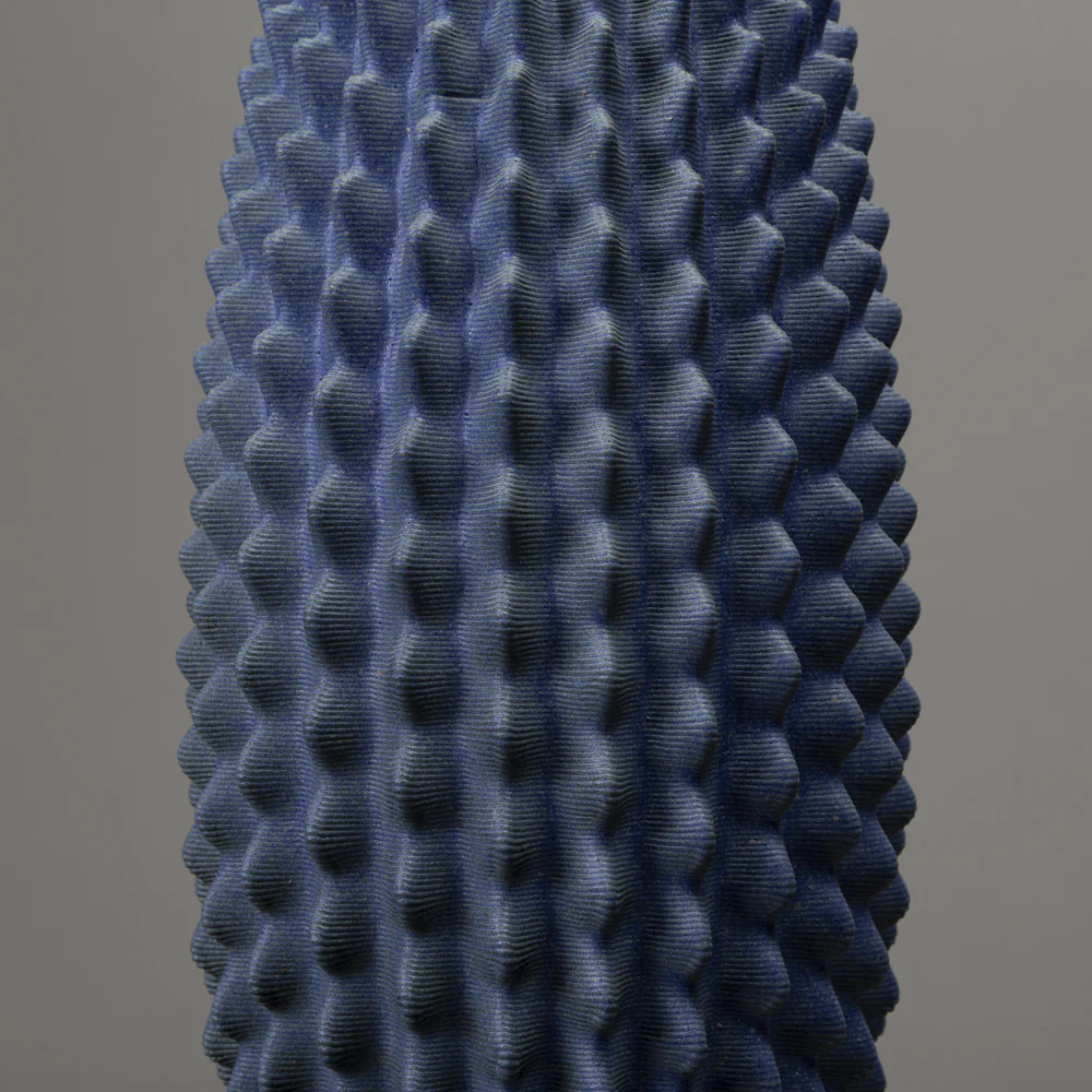 Binary Ceramics the cactus is one of nature’s most efficient designs. In the deserts where it evolved, every structural decision is a solution to a specific problem: maximise water storage, minimise exposed surface area, channel rainfall efficiently to the roots, survive years of drought. The ribs, the geometry, the height: none of it is arbitrary. It is engineering in the form of a plant. What draws me to the cactus as a source is not the object itself but the logic underneath it. The columnar form, the radial symmetry, the way structure and function have arrived at the same shape across thousands of species on multiple continents. These are the signatures of an algorithm that nature ran independently, again and again, arriving at the same answer.This piece begins with that logic and takes it somewhere else. The form is generated computationally, with the structural rules of cactus geometry as a starting point, freed from the original biological constraints. The result is recognisably cactus-like without being a cactus. It is what remains when you keep the mathematics and let go of the plant.The black clay body contrasts sharply with the blue glaze, which is applied selectively and reacts differently across the facets of the form. At 45 cm tall, the piece has the scale of a real specimen, present in a room, commanding in a corner.