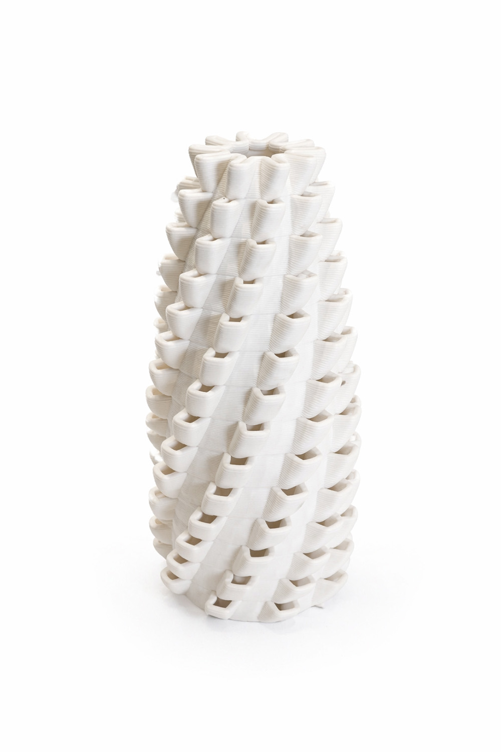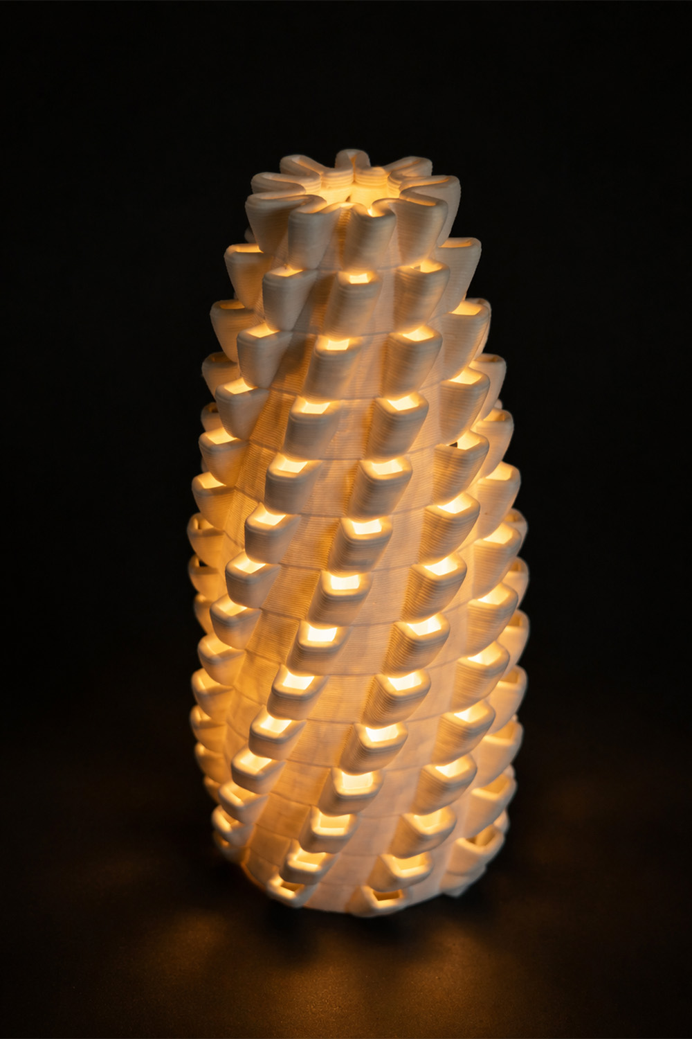 Binary Ceramics Reso Candle elegant 3d pronted porcelain candle holder with a sculptural spiral form and intricate layered texture. Designed to softly diffuse candlelight through its open geometric pattern, creating a warm ambient glow.  A contemporary decorative piece that combines modern digital craftmaship with the delicate look of porcelain. Made in Greece.