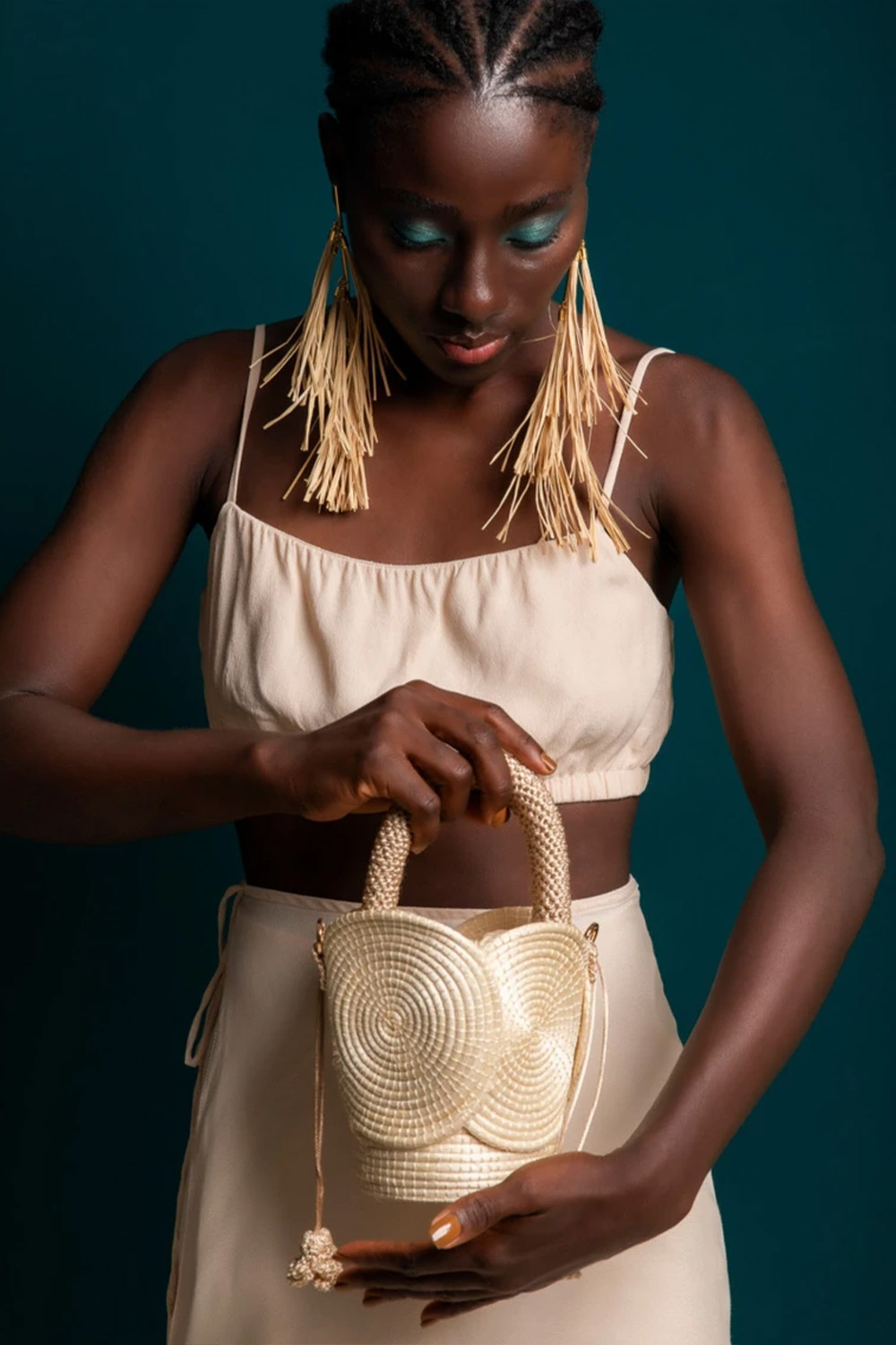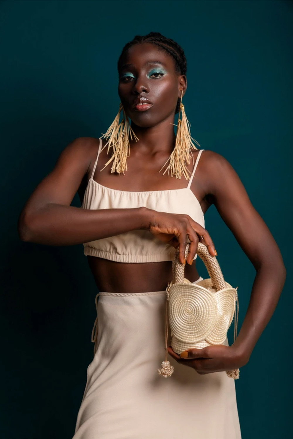 Catarina Mina Sisal straw bag with a crocheted tubular handle. Small rings on the sides allow for adding a strap and wearing it as a shoulder bag. Includes a sack-style inner lining with decorative trinkets. Carnaúba is celebration and manifesto. It is nature that dresses itself, it is roots that become weaving. Inspired by the tree that symbolizes Ceará, from which everything is used, the collection is born among fibers, leaves and fruits, translated into silk, linen, ramie cambric and cotton, in the touch of hands that weave crochet, bobbin lace, embroidery and richelliu lace. Each piece is a gesture of belonging, a breath of warm wind that passes through straw, art and history.