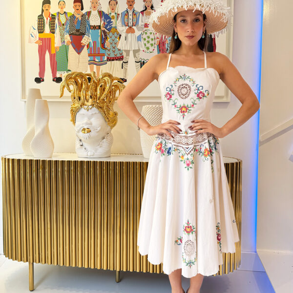 Celia Dragouni knitted is hand cut-out dress with a straight neckline, open back and laces made from the same fabric and a handmade motif. A one-of-a-kind handmade clothing set, crafted with attention to detail and quality.