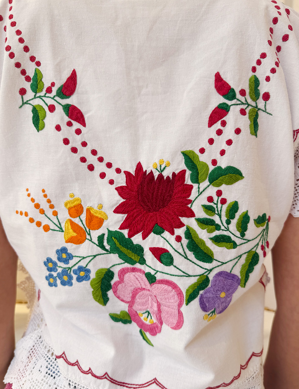 Celia Dragouni white top with tassel and colorful hand Knitted flowers. A one-of-a-kind handmade clothing set, crafted with attention to detail and quality.