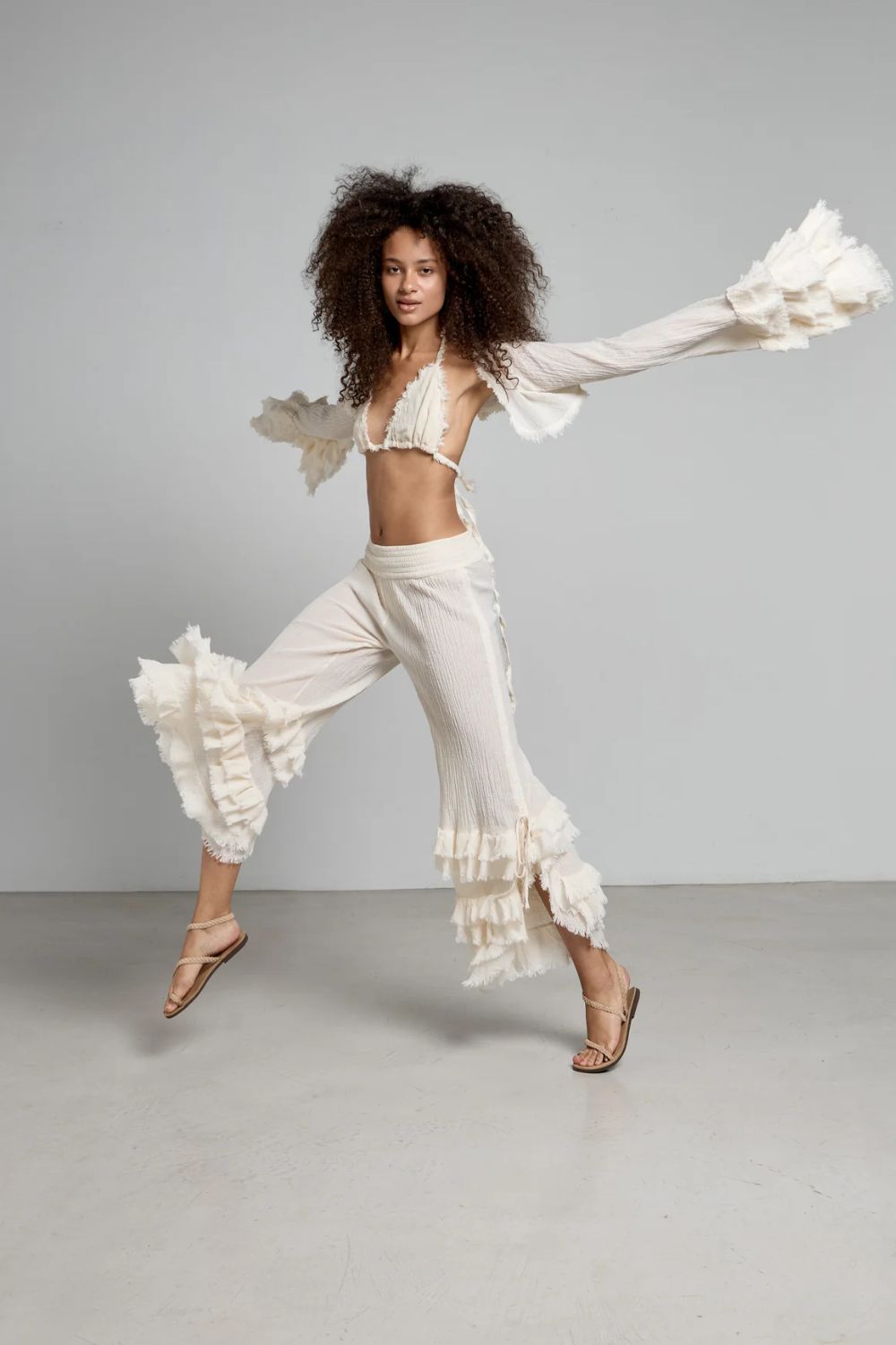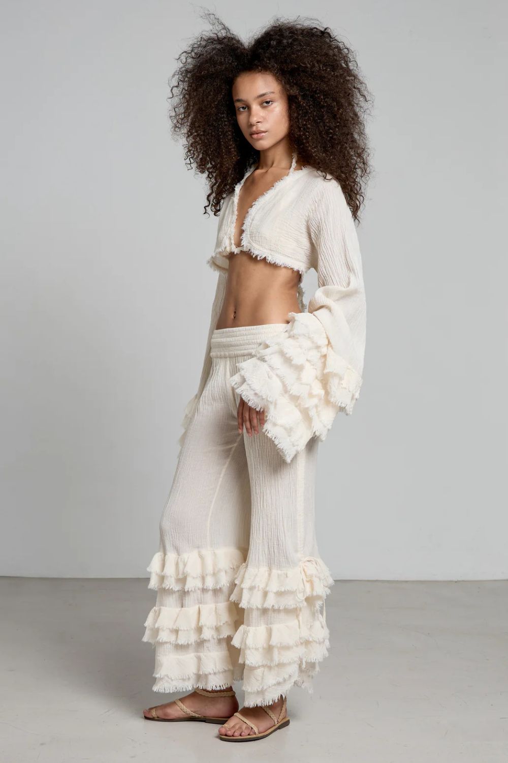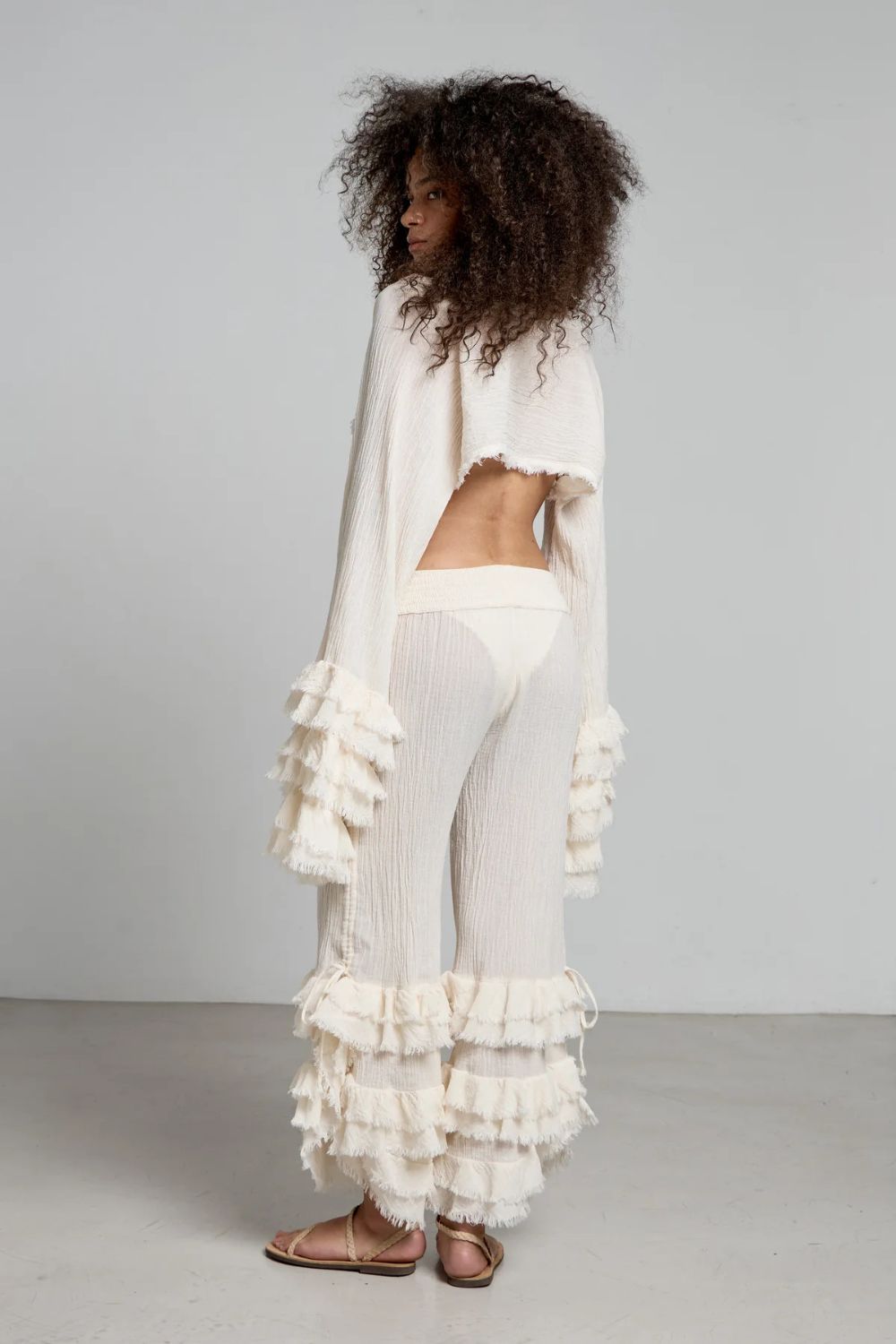Christian Zen this cropped ruffled top is handmade from cotton-gauze and designed with long fringed sleeves and a tie-fastening front for wrapping over your swimsuit. Wear it with the  Savanah pants for a complete look.Made in Greece.