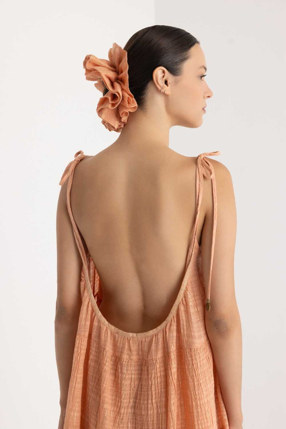 Christian Zen Mirabella maxi dress embodies effortless summer style with a soft, romantic touch. Designed in a flowing full-length silhouette, it features delicate tie-up shoulder straps and a relaxed fit that drapes beautifully on the body. The lightweight, textured fabric adds subtle dimension and a gentle shimmer, while the tiered construction creates graceful movement with every step. Rendered in a warm peach-coral hue, it’s the perfect choice for sunny days, vacations, or casual chic outings. Complete with a matching scrunchie for a coordinated finish, this dress combines comfort and femininity in one timeless piece.
