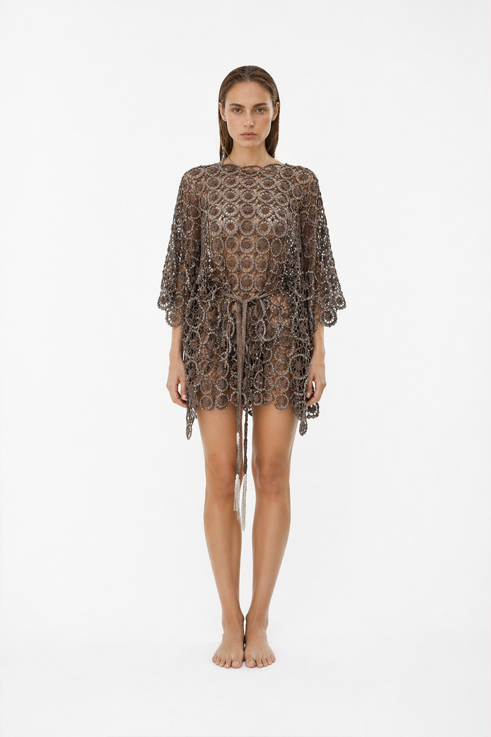 Christian Zen Zenaugusta Mini Dress  Mivi Lace Dress with Sequins and Belt in Stone Gray is an elegant and contemporary statement piece that combines delicate craftsmanship with modern resort style. The mini dress features an intricate lace pattern embellished with subtle sequins that add a soft shimmer and texture to the design. Its relaxed silhouette is complemented by wide three-quarter sleeves and a matching belt that cinches the waist, creating a flattering and feminine shape. The semi-sheer lace construction enhances the lightweight and airy feel of the dress, making it perfect for layered styling over swimwear or as a sophisticated summer outfit. The refined stone-gray tone adds a modern and versatile touch, suitable for both daytime resort wear and evening occasions.