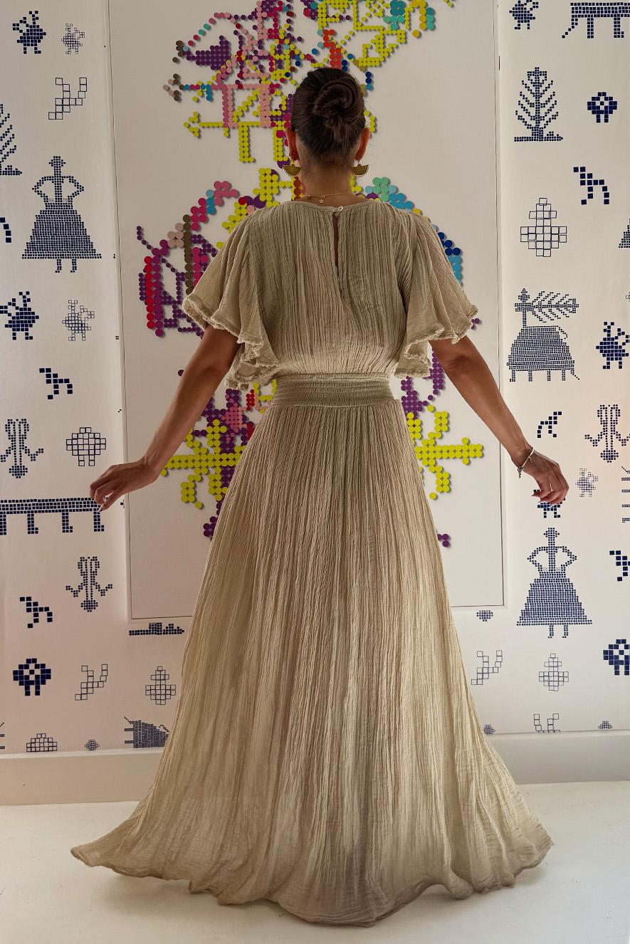 D’Artemide maxi dress features a soft sand, pleated fabric, oversized silhouette with flutter sleeves and round neckline, accented by a small central front hole opening.