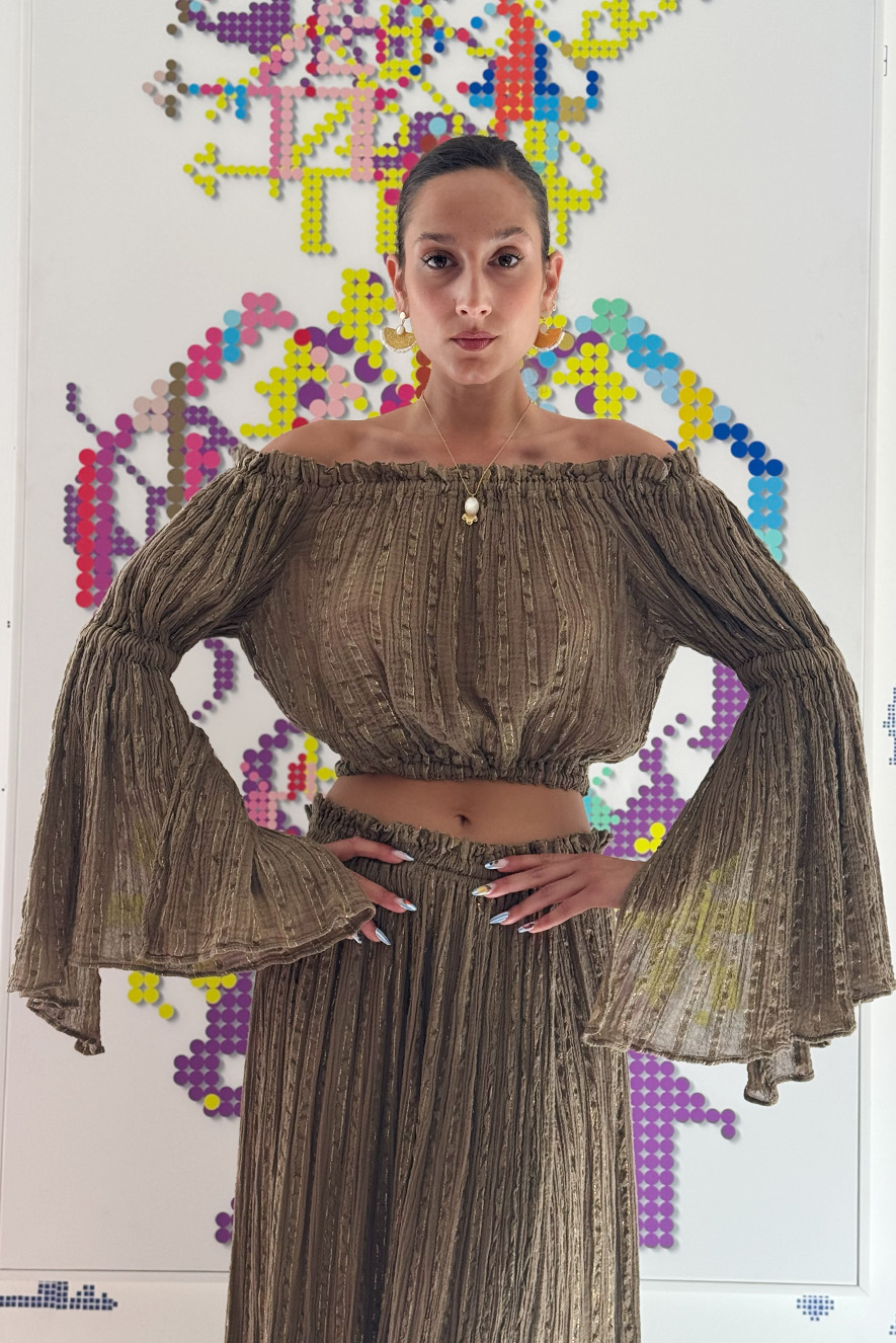 D’Artemide top Ariana with elasticated neckline and waist offer a flattering silhouette, while the soft long sleeves add a touch of vintage charm.