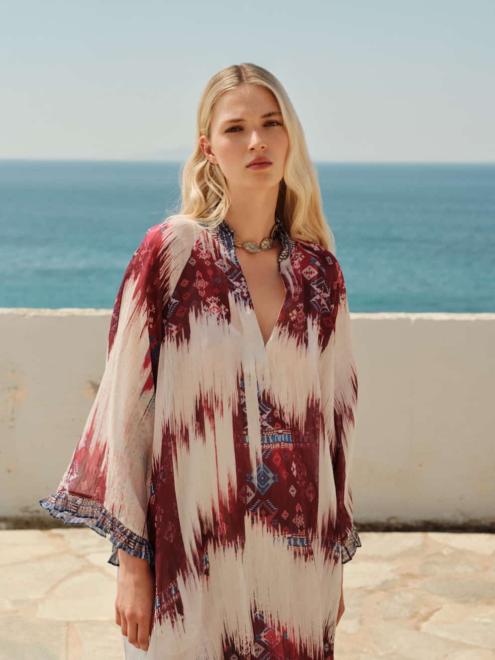 Devotion long kaftan in burgundy and ecru shades with a special print. It features a V-neckline and wide, airy sleeves that provide comfort and elegant movement and side slits. Its loose line is accompanied by an inner petticoat for greater coverage and comfort. Ideal for summer looks from morning to evening.