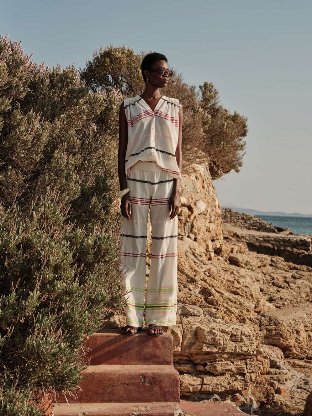 Devotion pants with thin horizontal stripes, long, with elastic at the waist. Made in Greece.
