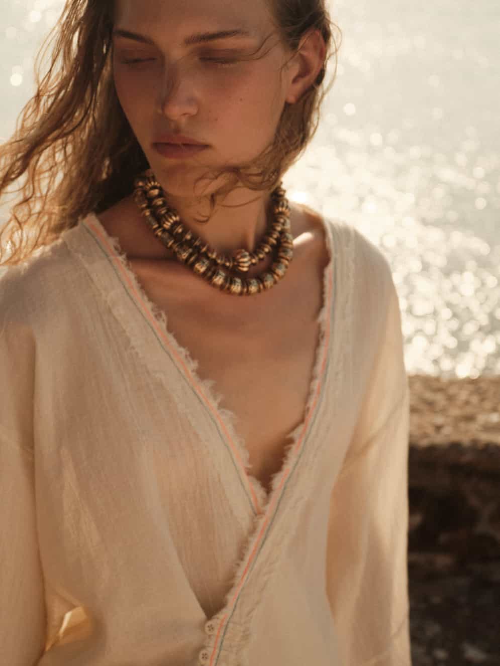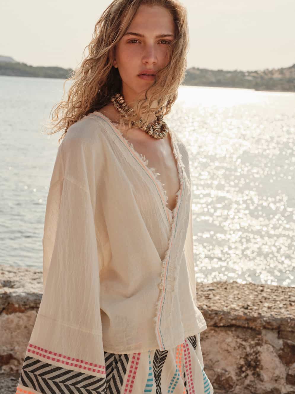 Devotion airy kimono with a V neckline and discreet side tie, wide sleeves with special woven ethnic details add character and boho aesthetics.