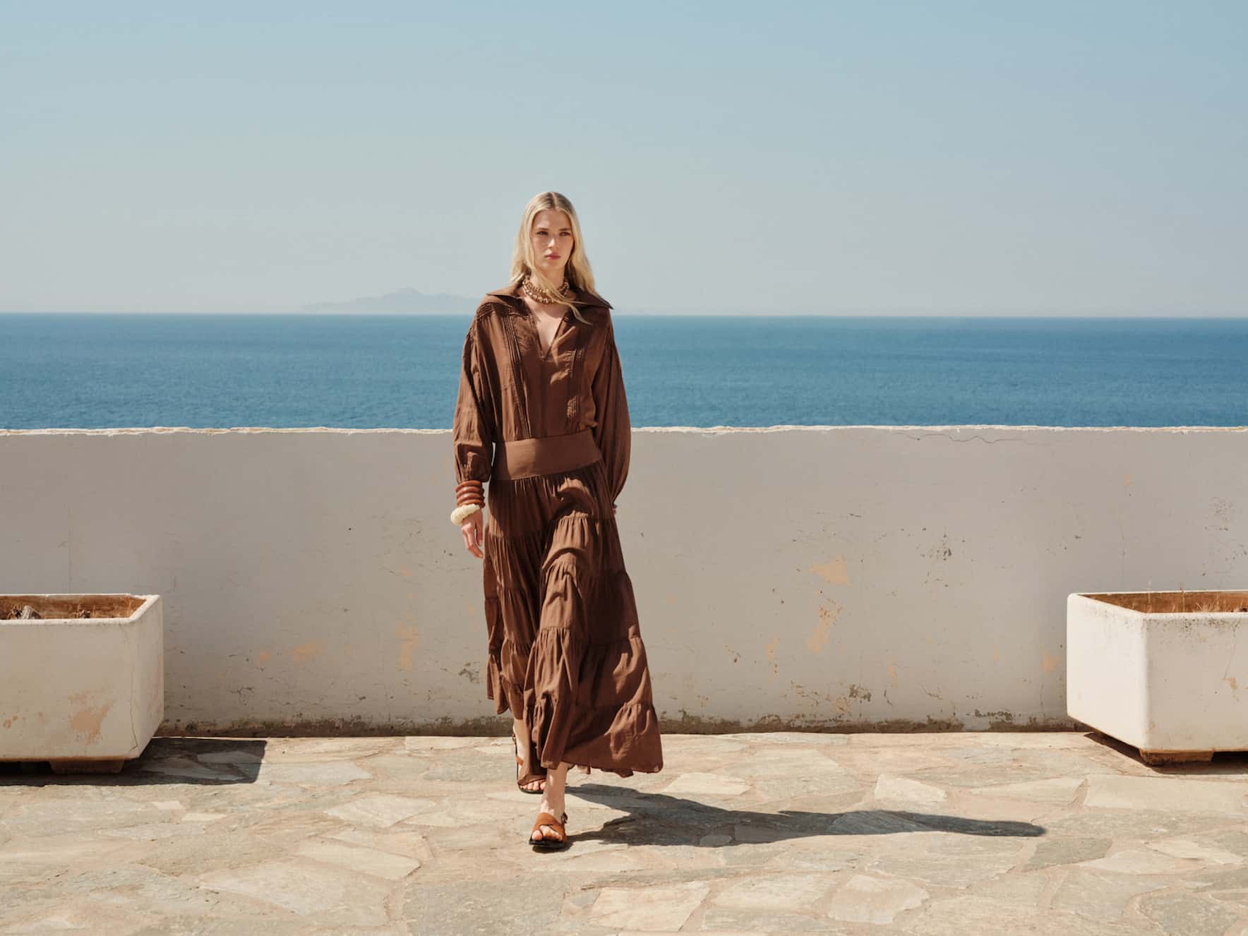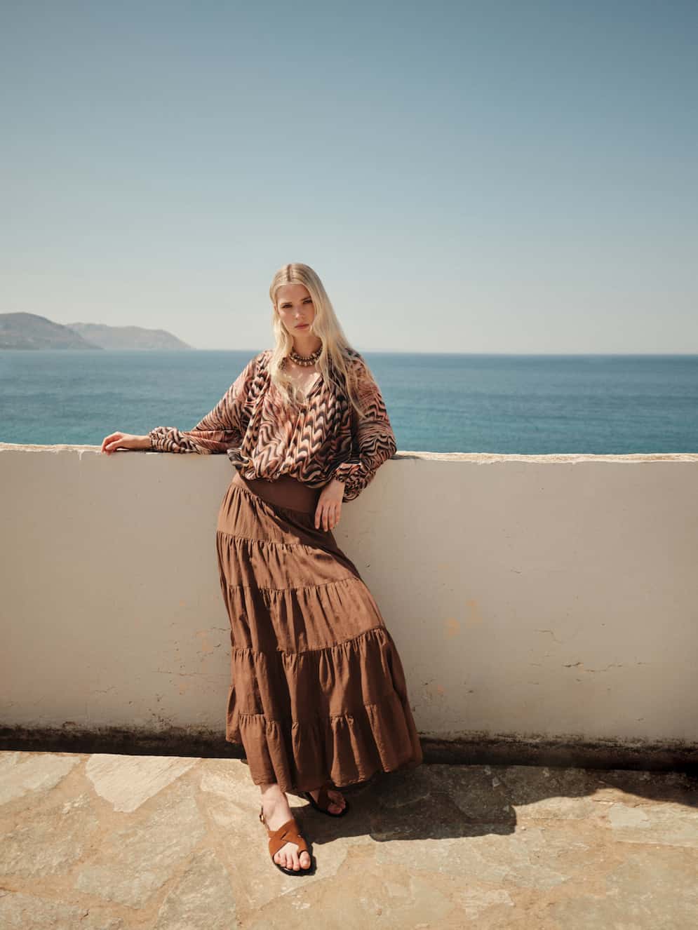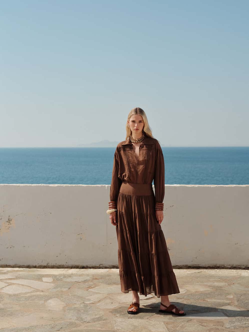 Devotion maxi skirt in voile fabric, elastic waist, multi-layered line with seams, light and airy texture.