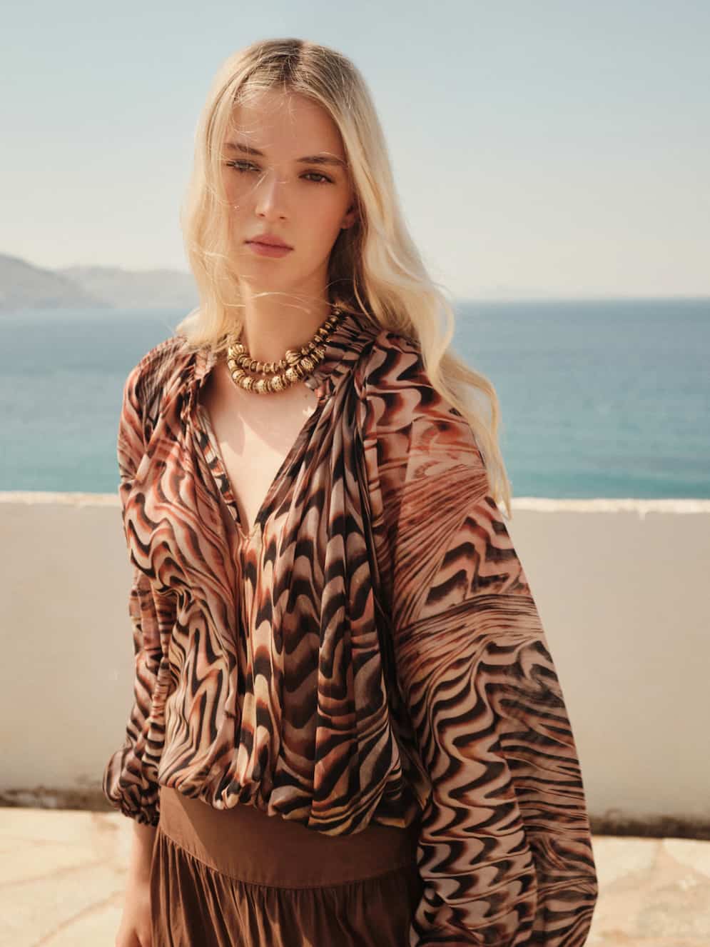 Devotion airy blouse with a striking abstract pattern in earthy shades of brown, beige and black. It features a V-neckline with a discreet opening and a light ruffle on the chest that flatters the silhouette. The long sleeves with elastic trim add femininity and comfort, making the piece ideal for all hours of the day. It can be easily combined with both pants and a skirt, for chic casual or more elegant looks.
