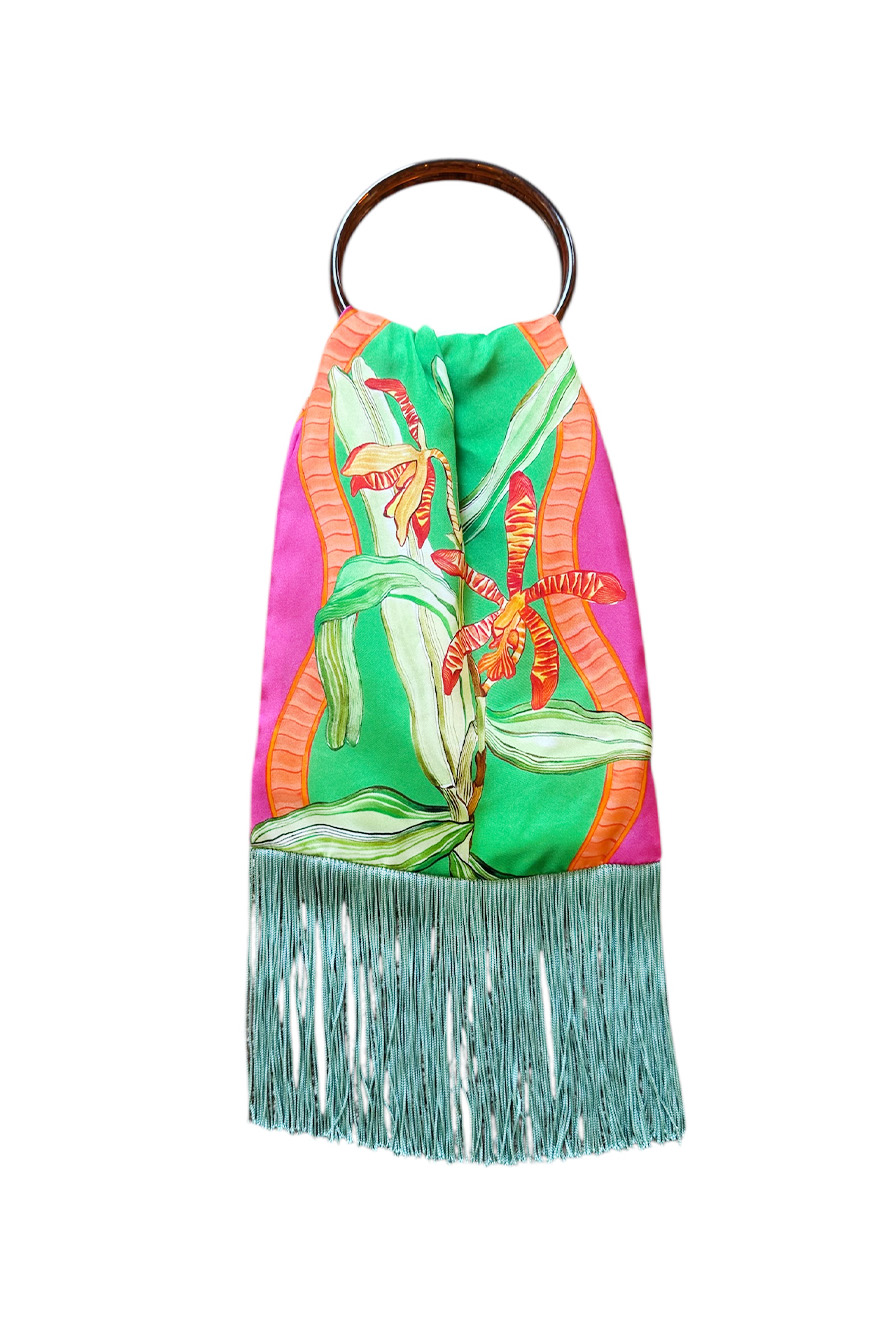 Eleni Malami small silk bag with fringe, an unusual yet striking colour combination. Made in in Brighton, England.