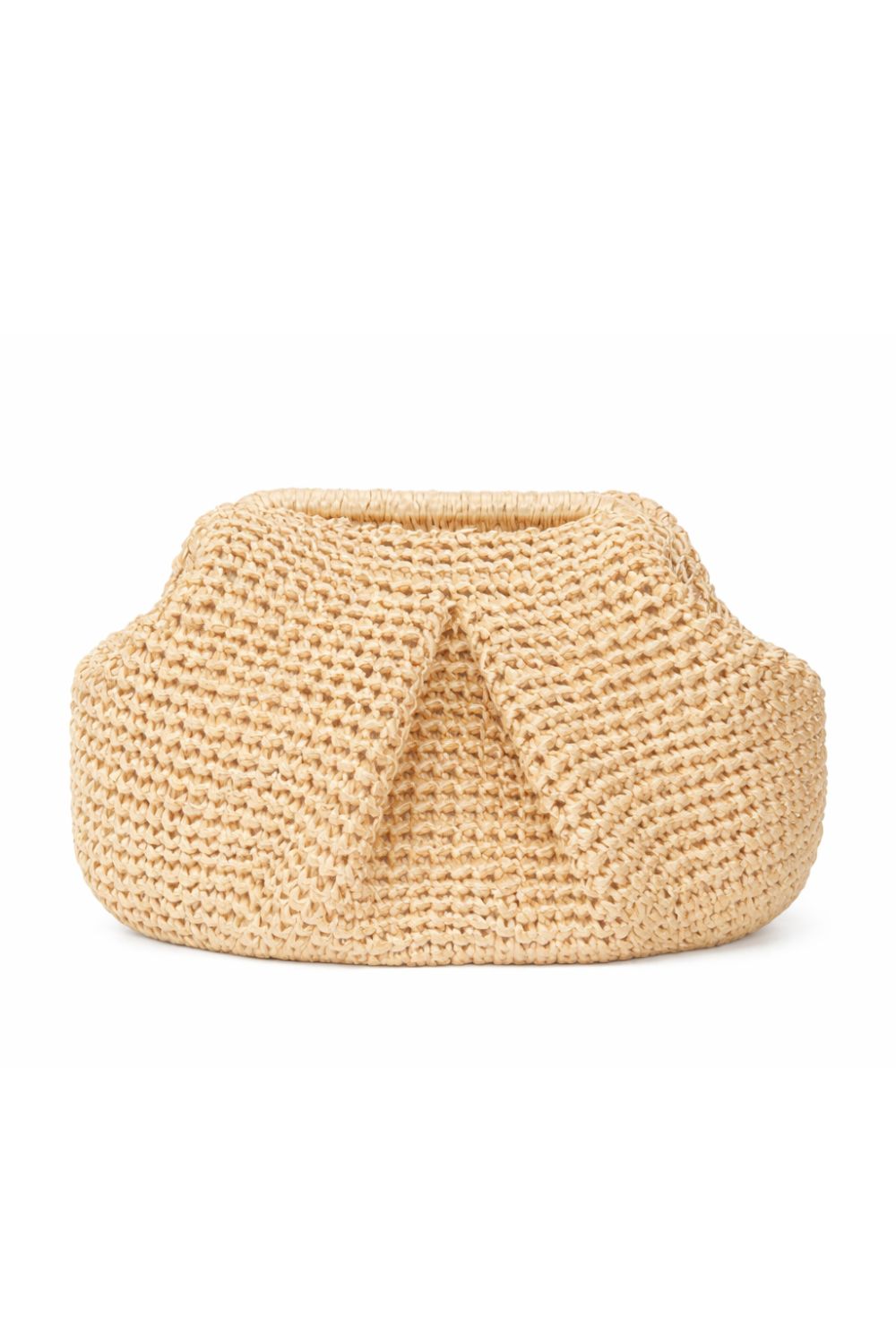 G&K Handcrafters clutch, handmade from weaved raffia embellished with pleated details.