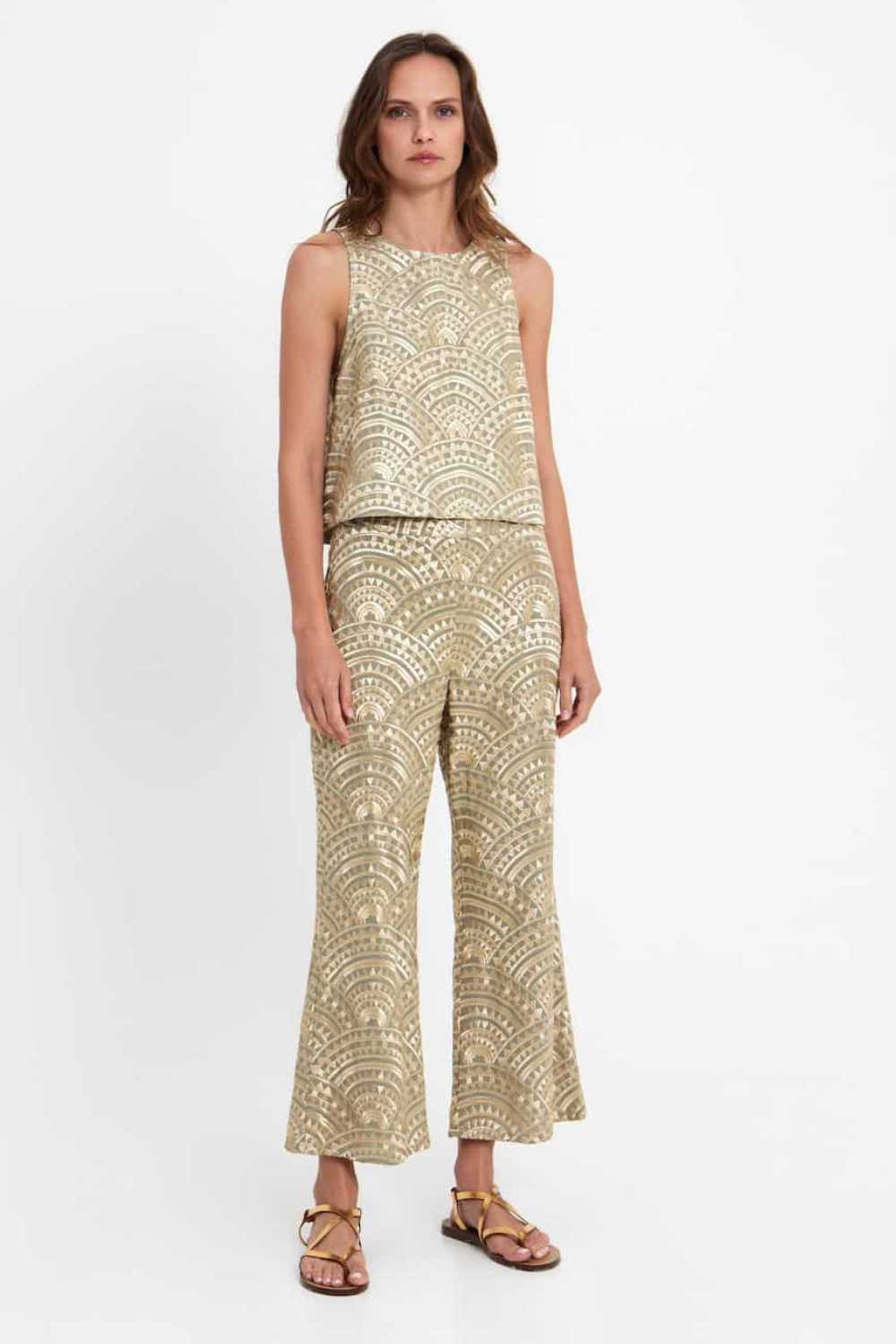 Greek Archaic Kori cotton pants in a high-waisted fit that falls into a crop and a slightly flared finish decorated with impressive embroidery in a geometric pattern.
