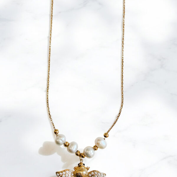 Ifigenia Loukou long necklace decorated with pearls, small gold balls and a bee pendant decorated with pearls. Hand Made. Made in Greece.