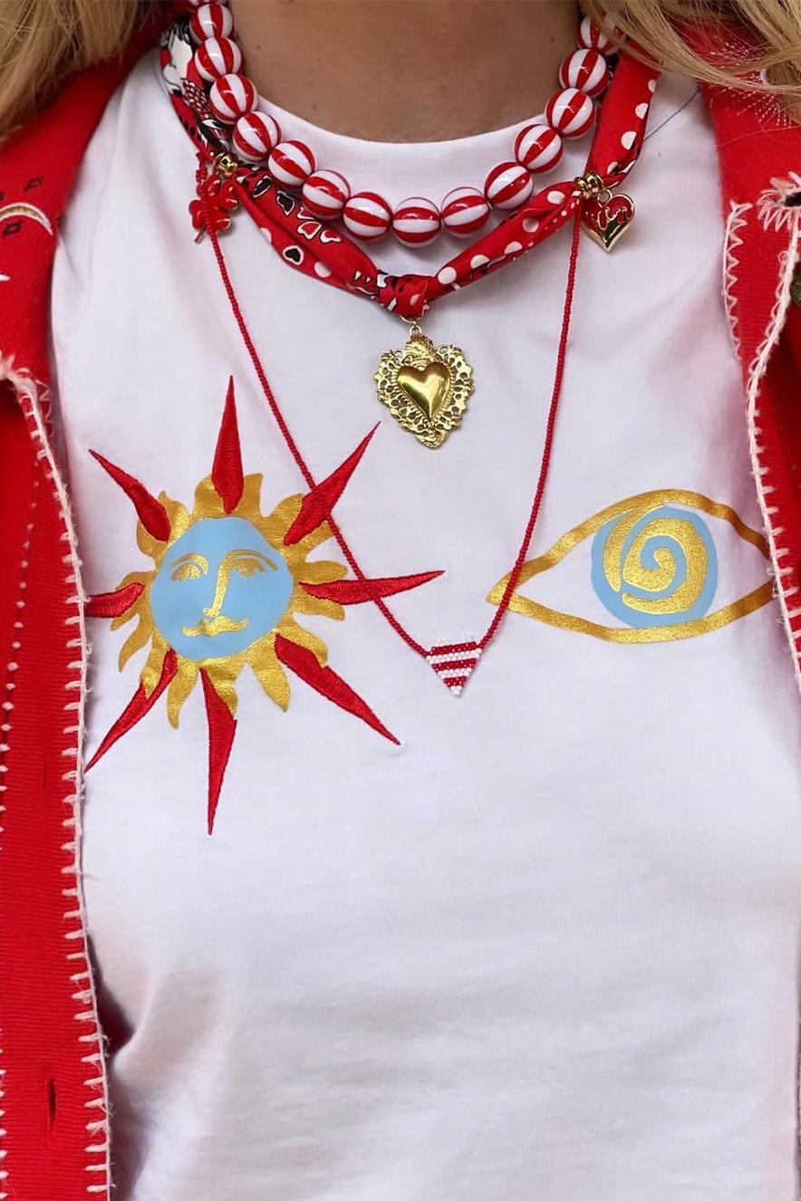 Ifigenia Loukou acrylic necklace features striking round beads in a bold red and white striped pattern. The unique color combination creates a playful and modern effect that instantly catches the eye and adds vibrancy to any outfit. The glossy acrylic beads are lightweight and comfortable to wear, while the metal chain with an extension allows for easy length adjustment, ensuring a perfect fit around the neck. The necklace’s design blends a bold character with refined elegance, making it suitable for both everyday looks and more special occasions.A distinctive piece by Ifigenia Loukou, this necklace adds color, style, and personality to every look.