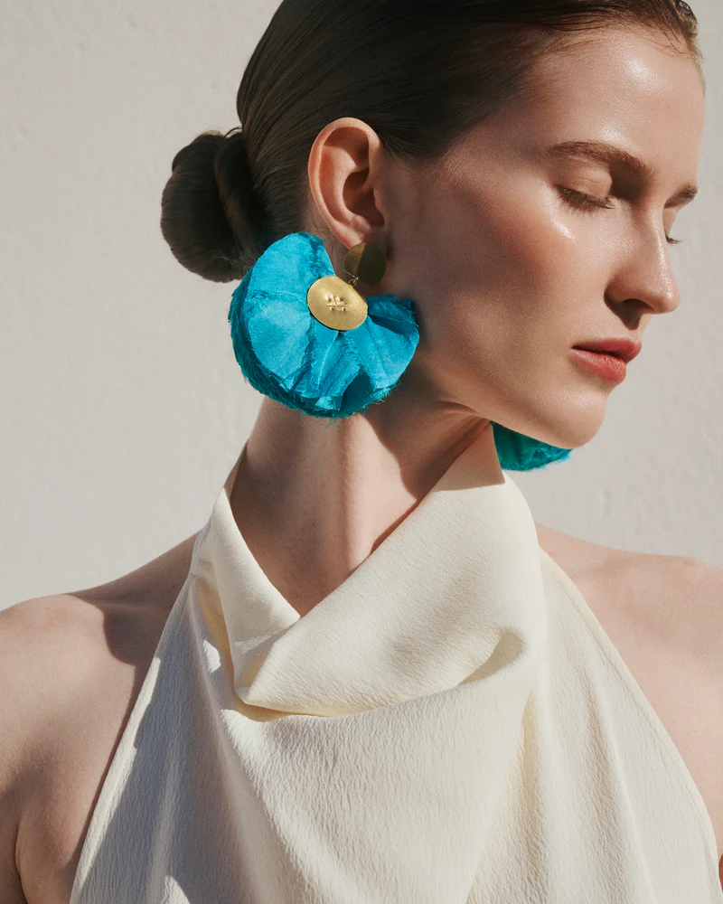 Katerina Makriyianni elevate any outfit with the dramatic elegance of the Silky Fan Earrings, one of our signature designs. Handcrafted with care, these earrings combine airy silk with fine metals to create a striking, yet lightweight jewellery piece that moves with you.