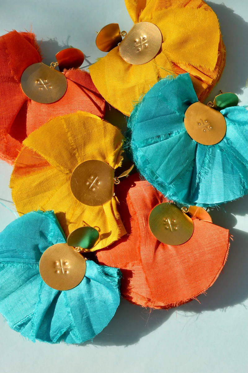 These earrings feature a fan‑shaped silk motif, paired with handmade bronze hoops and premium finishing touches. Whether worn with a formal dress or styled with casual denim, they exude confident femininity and artisanal sophistication.