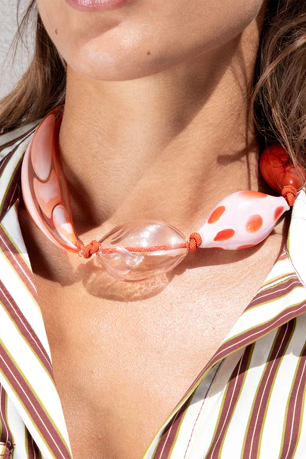 Katerina Psoma Designed by Katerina and mouth-blown by Murano masters in Venice, each bead in this necklace is a small work of art. Lacquered red tubes, cream swirl drops, a polka-dotted milky oval sit together on a fine adjustable cord, catching and playing with light in that unmistakable way only Venetian glass can. The sliding cord allows the necklace to be worn exactly where you want it high and close, or long and loose making it as versatile as it is striking. Statement scale, featherlight feel, and the quiet pride of something made entirely by hand, for you.