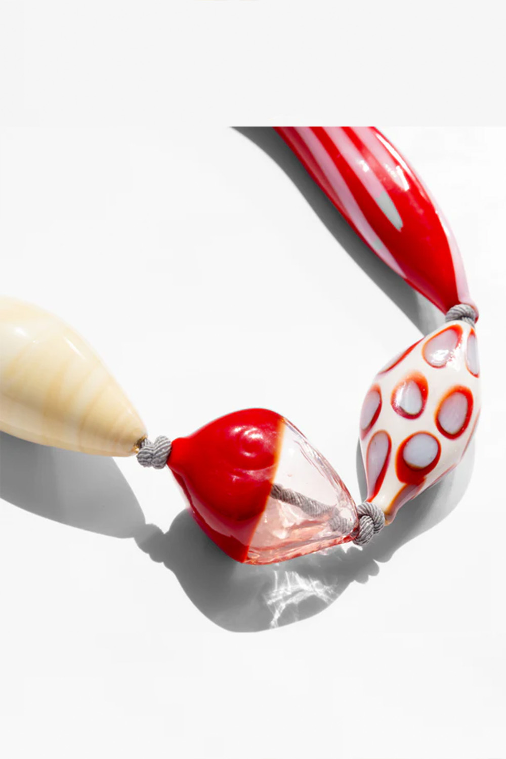 Katerina Psoma designed by Katerina and mouth-blown by Murano masters in Venice, each bead in this necklace is a small work of art. Lacquered red tubes, cream swirl drops, a polka-dotted milky oval sit together on a fine adjustable cord, catching and playing with light in that unmistakable way only Venetian glass can. The sliding cord allows the necklace to be worn exactly where you want it high and close, or long and loose making it as versatile as it is striking. Statement scale, featherlight feel, and the quiet pride of something made entirely by hand, for you.