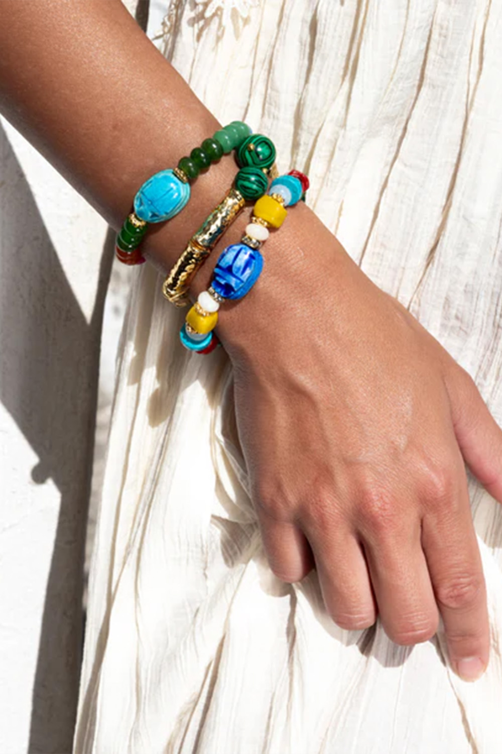 Katerina Psoma a full rainbow of polished agate beads fuchsia, orange, forest green, sky blue, lavender and deep violet — arranged in a perfect chromatic arc, anchored by a turquoise ceramic scarab flanked by tiny gold spacers. In ancient Egypt, the scarab was the ultimate symbol of rebirth, protection and optimism — worn here on your wrist as a quiet reminder that good things are always coming. Elastic and effortless to wear, it stacks beautifully or holds its own. A bracelet with a soul.