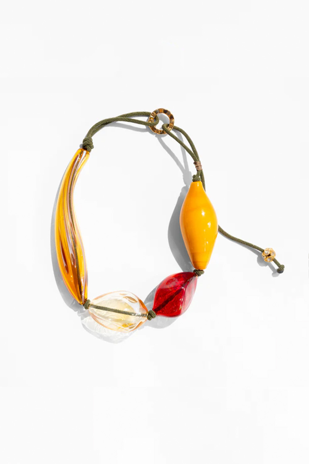 Katerina Psoma designed by and mouth-blown by Murano masters in Venice, each bead in this necklace is a small work of art. Lacquered red tubes, cream swirl drops, a polka-dotted milky oval sit together on a fine adjustable cord, catching and playing with light in that unmistakable way only Venetian glass can. The sliding cord allows the necklace to be worn exactly where you want it high and close, or long and loose making it as versatile as it is striking. Statement scale, featherlight feel, and the quiet pride of something made entirely by hand, for you.