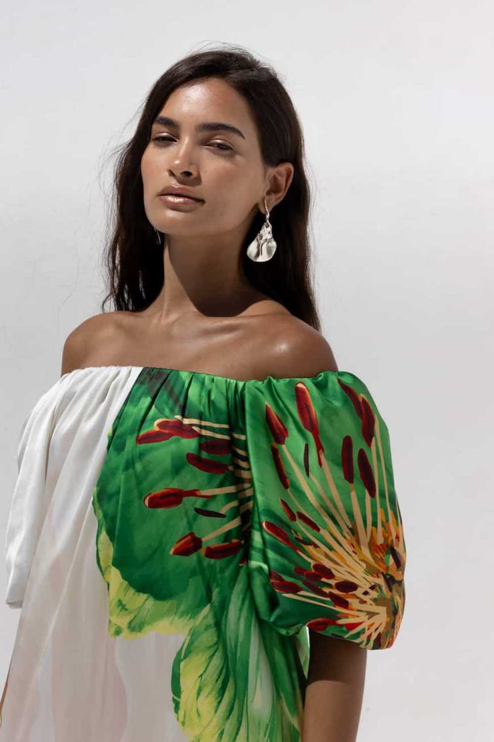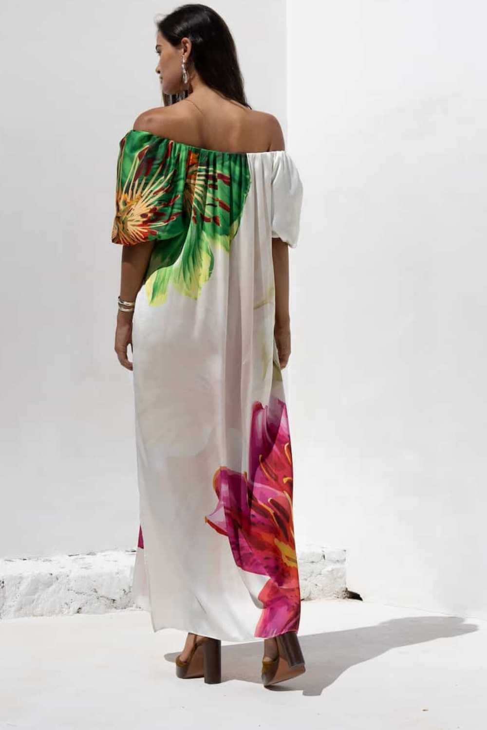 Nema maxi dress with an elasticated neckline and ruffles that can also be worn off-shoulder. It features short, wide sleeves and a relaxed, comfortable fit. The design stands out for the impressive floral print in bold shades that covers the bottom of the dress.
