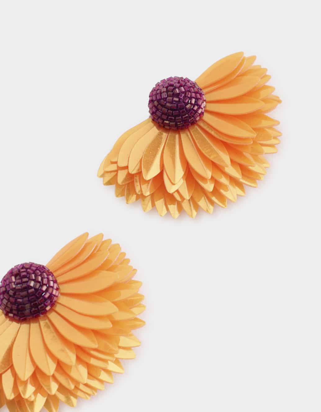 Olivia Dar our iconic earrings the Marigold saffron earrings. Fully hand-embroidered with sequins and glass beads.Mounted on gold-plated brass posts, they are lightweight and comfortable, designed to be worn from day to night.