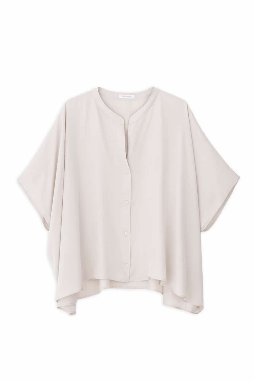 Philosophy short-sleeved satin shirt in an oversized line, airy fabric with a soft, silky texture, round neckline with a discreet opening and buttons, short, wide sleeves that offer movement, asymmetrical finish with a fluid fall.
