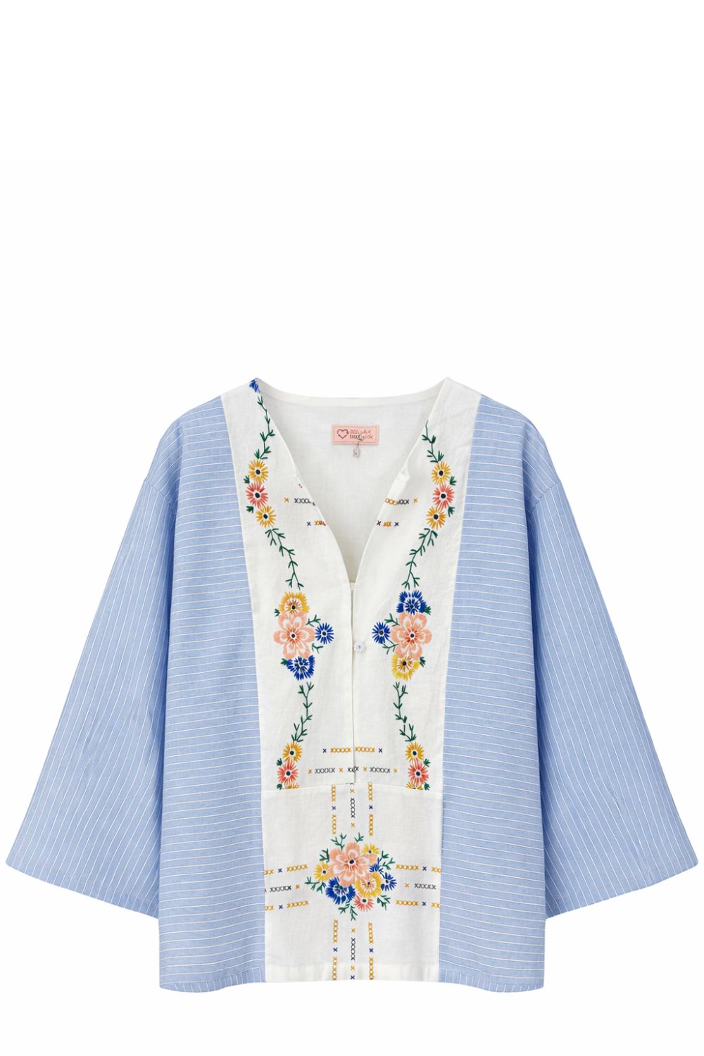 Relax Relux one-of-a-kind vintage blouse inspired by traditional house textiles. this standout piece features delicate floral embroidery in doft, multicolores tones, contrasted with airy tstriped sleeves for a unique, modern twist. Front closure offers an effortless balance betweenartisanal craftsmanship and contemporary elegance.