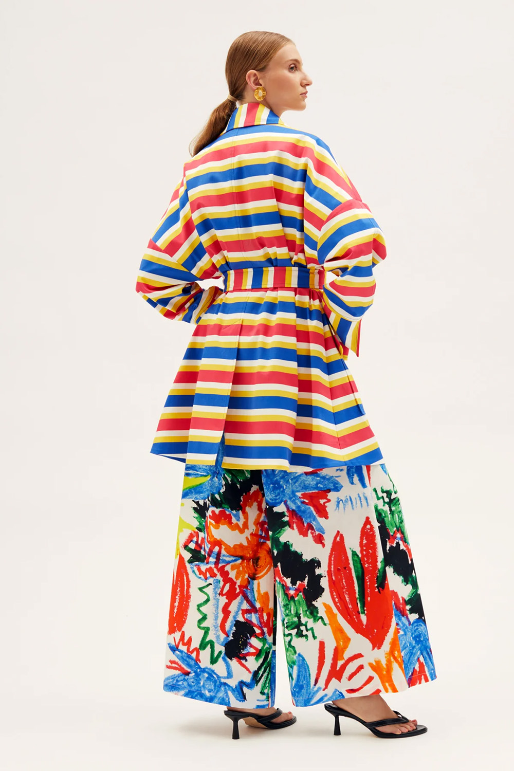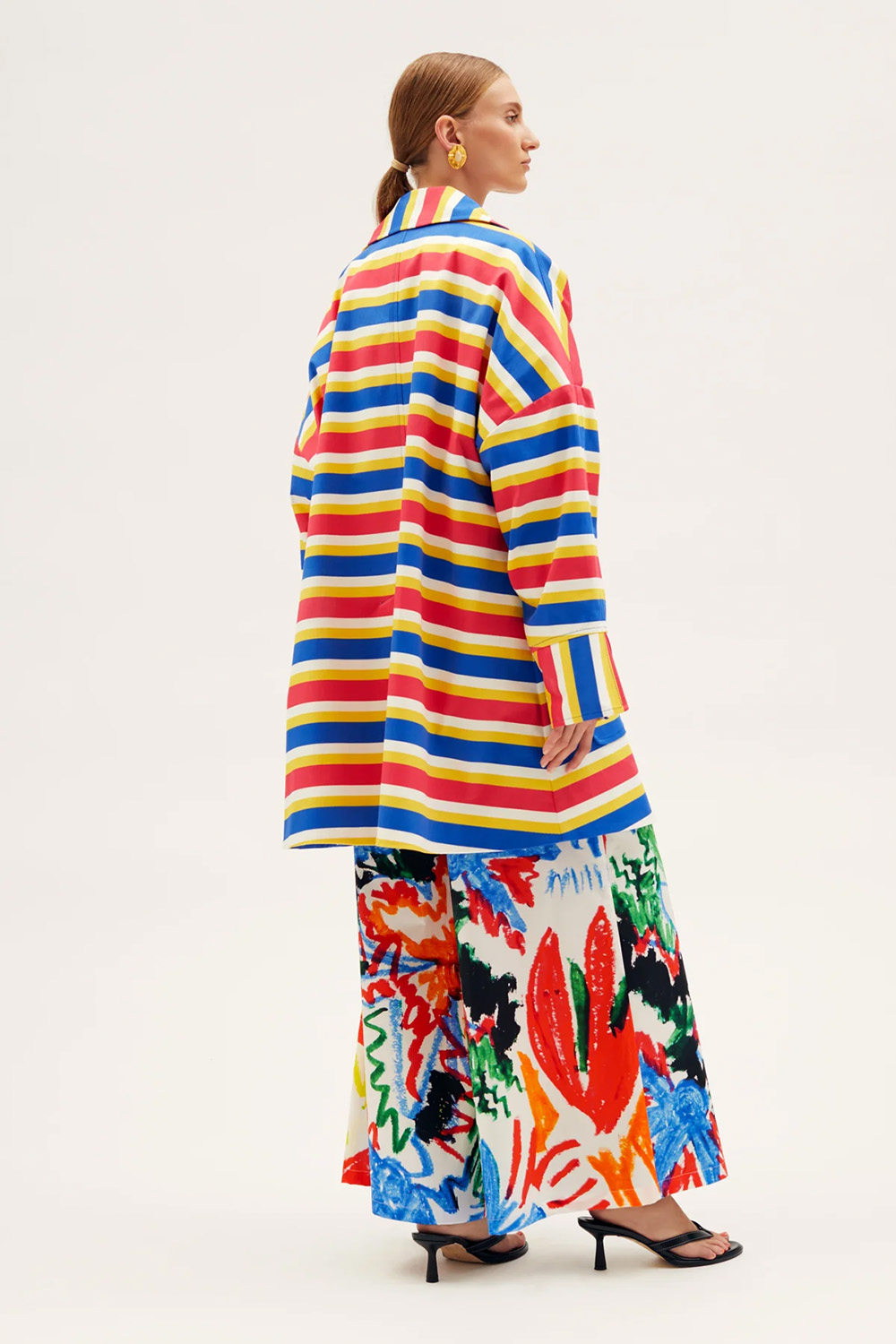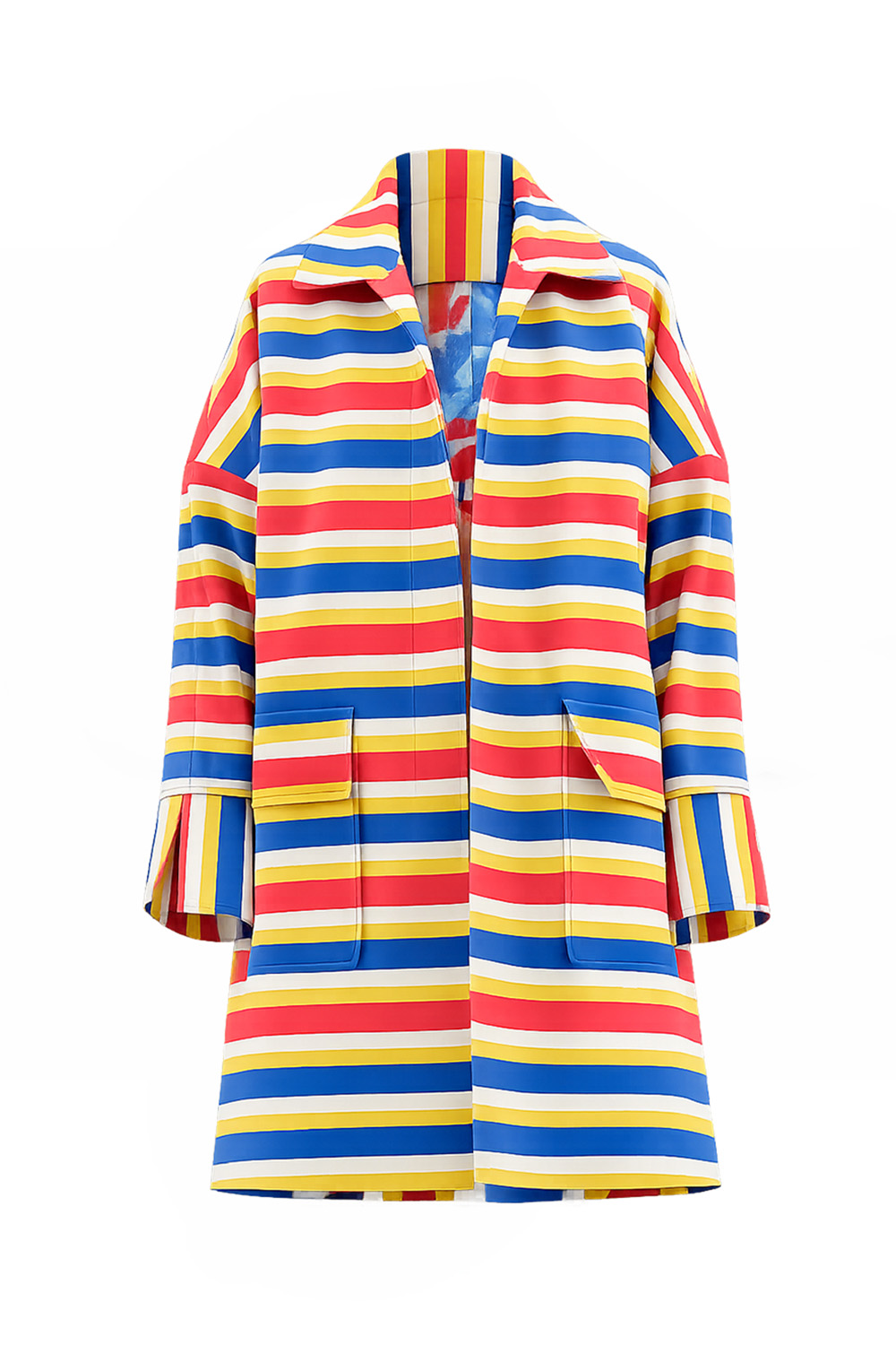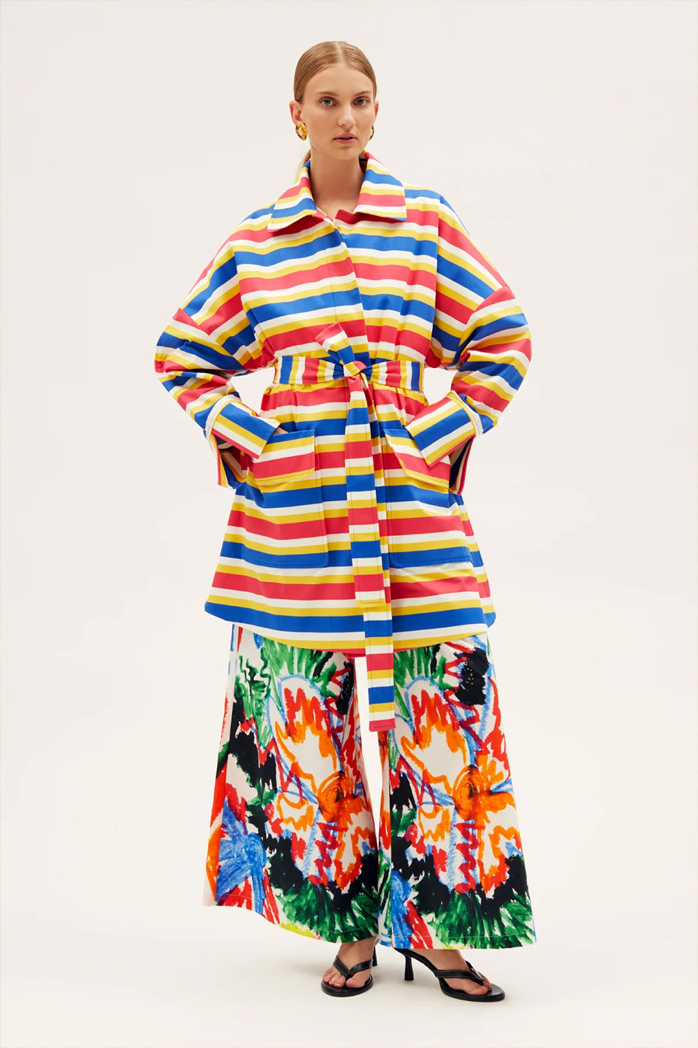 RIANNA+NINA the Tropica Fruta Caban Jacket Roberta shines in our Tropica Fruta print Naftis Primary. The structured fabric draws a strong silhouette defined by a big collar, two oversized front patch pockets, and a slit in the back. The waist can be accentuated with an additional belt creating a modern yet feminine appearance.