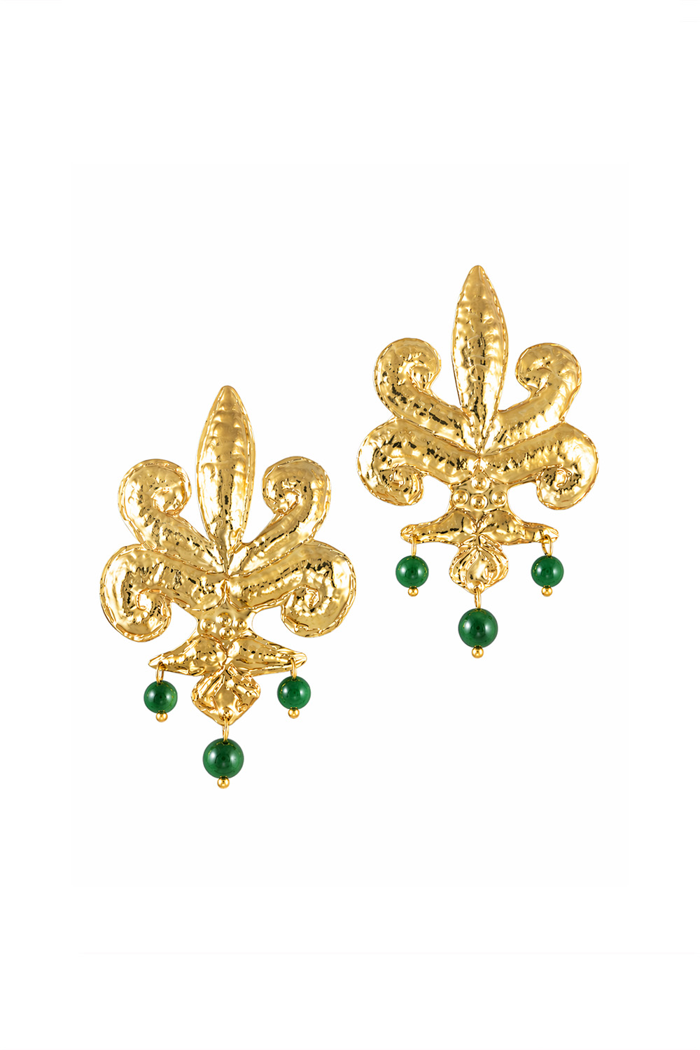 Valeska Jewellery elegant earrings crafted from gold plated bronze, featuring a bold ornamental design inspired by classical motifs. The sculptural form is beautifully detailed with curved elements and a textured finish, creating a striking statement piece. Three green bead drops hang delicately from the base, adding color, movement, and a refined contrast to the warm gold tone. Perfect for both everyday elegance and special occasions, these earrings bring a timeless and artistic touch to any look.