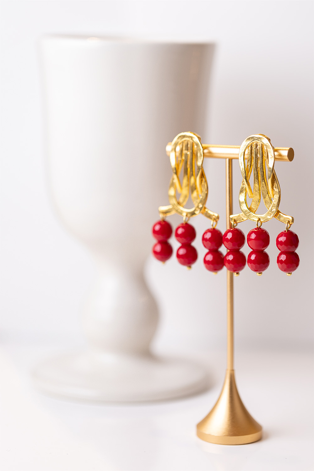 Valeska Jewellery statement earrings featuring an elegant sculptural design with intertwined curves. The earrings are finished with three dangling drops of faceted red beads that add movement and a vibrant touch of color. Their bold yet sophisticated style makes them perfect for both special occasions and stylish everyday wear.