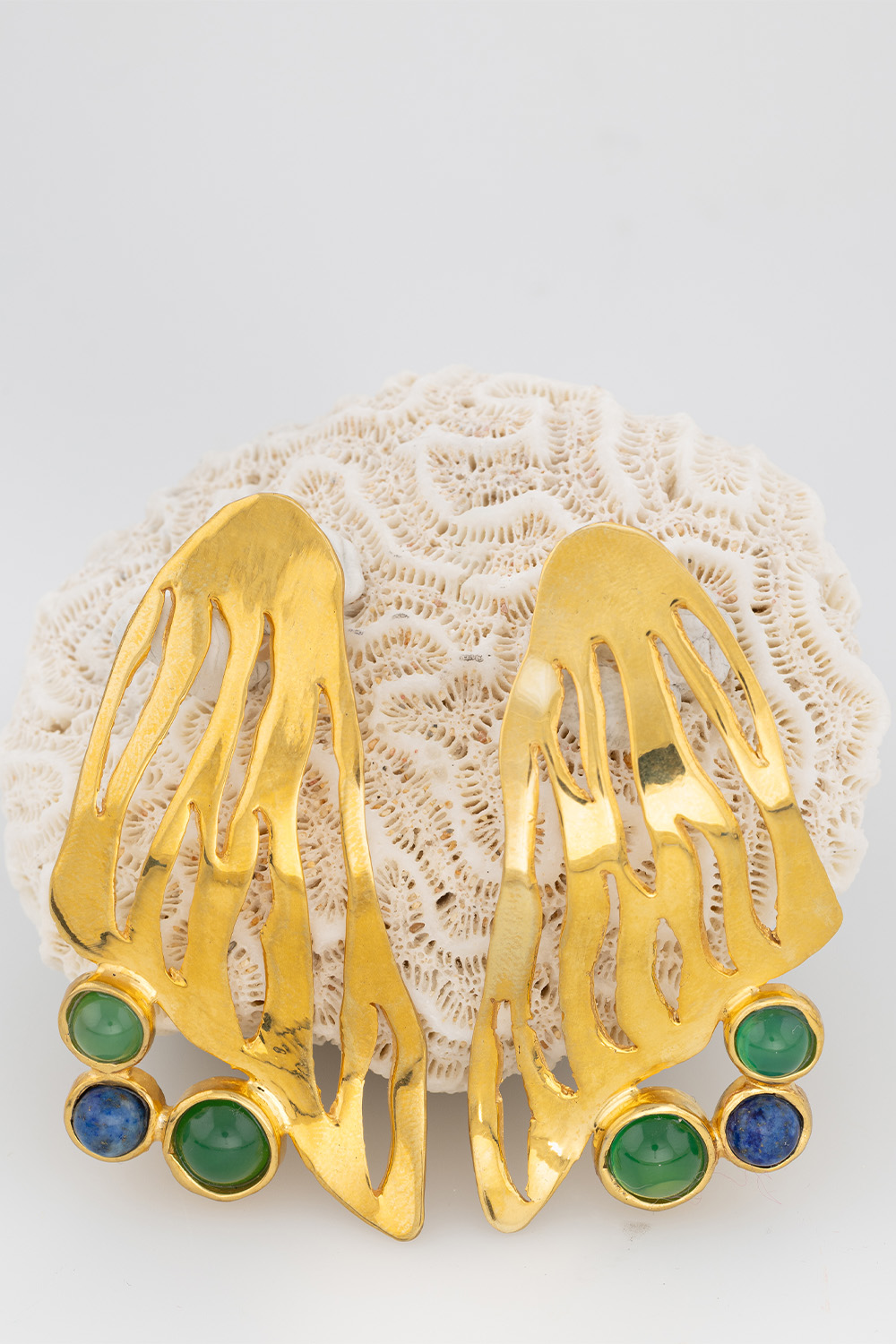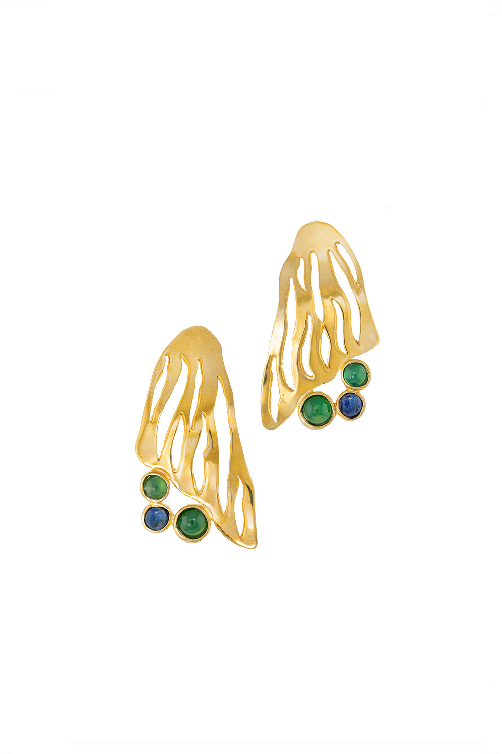 Valeska Jewellery gold-plated bronze statement earrings featuring an organic openwork design inspired by flowing natural forms. The sculptural silhouette creates a bold yet elegant look, while three round cabochon stones at the base add a vibrant touch of color. The combination of green and deep blue stones beautifully contrasts with the warm gold tone, giving the earrings a distinctive and artistic character.