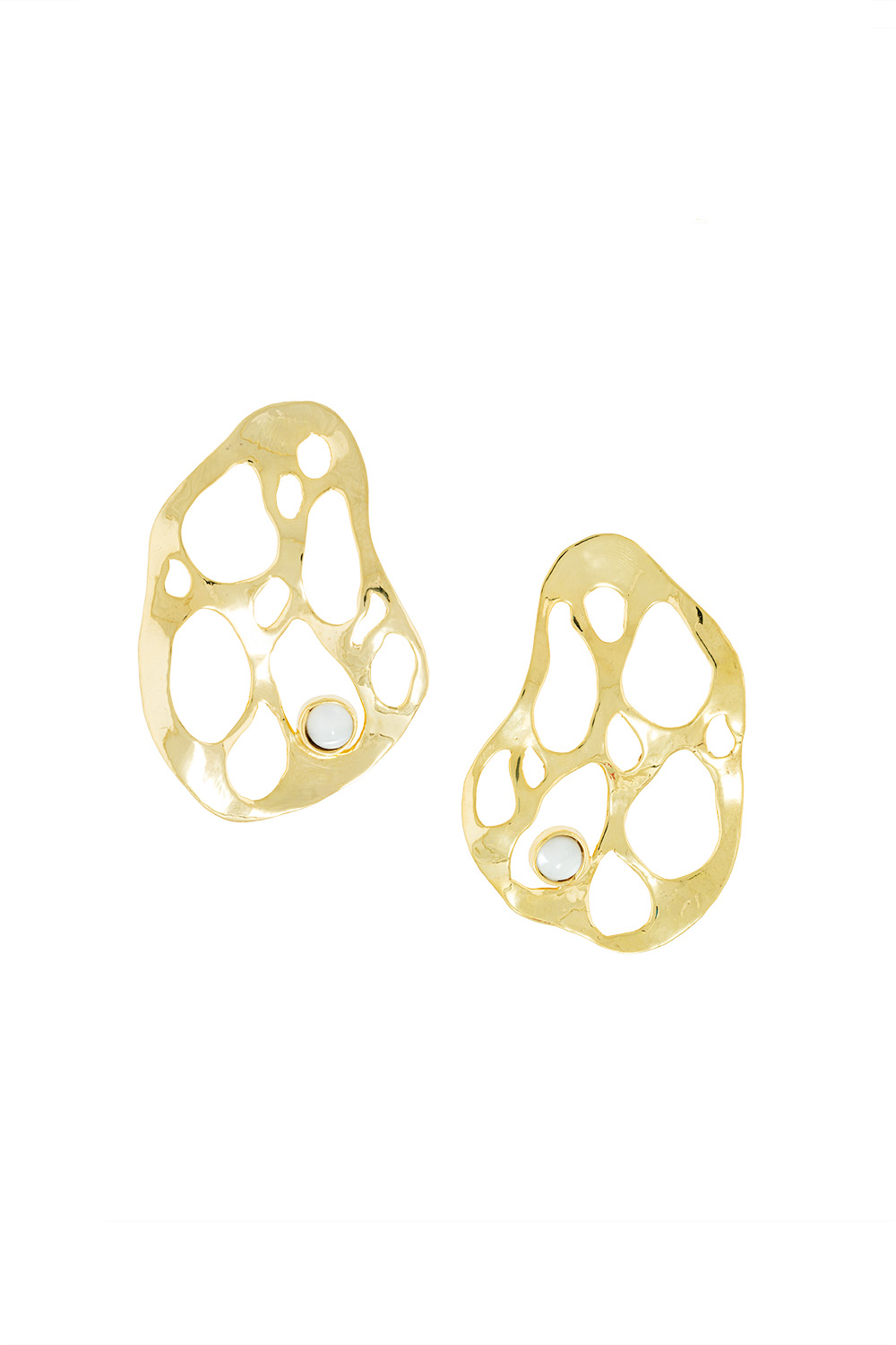 Valeska Jewellery contemporary earrings crafted from gold plated bronze, featuring an organic openwork design with fluid, sculptural shapes. The irregular cut-out pattern creates a modern artistic look, while a black cabochon stone set at the base adds a bold contrast to the warm gold tone. Distinctive and elegant, these earrings are perfect for adding a modern statement to both everyday outfits and special occasion looks.