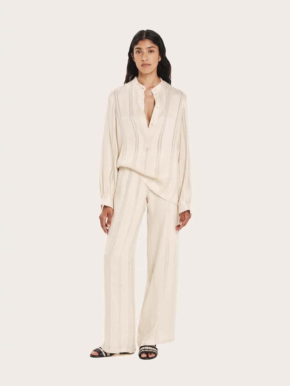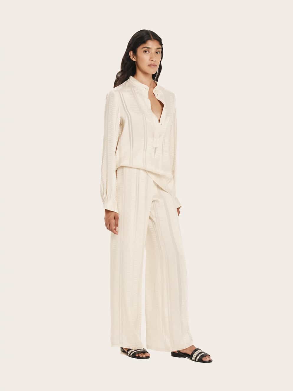 ZEUS+DION the ‘Hera’ blouse is a timeless Zeus+Δione signature that embodies modern Greek elegance. Updated for the season, it’s crafted from Tempo spathoto jacquard silk in ecru, woven in Soufli, the historic northern Greek town celebrated for its artisanal silk craftsmanship. Designed with a classic fit and a refined collarless neckline, it’s a versatile piece that transitions effortlessly from day to evening. A true wardrobe investment.